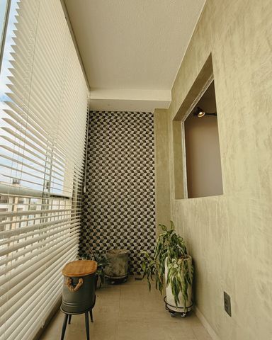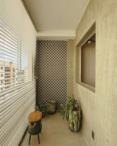 Varanda gourmet com portas de vidro e persianas em alumínio.