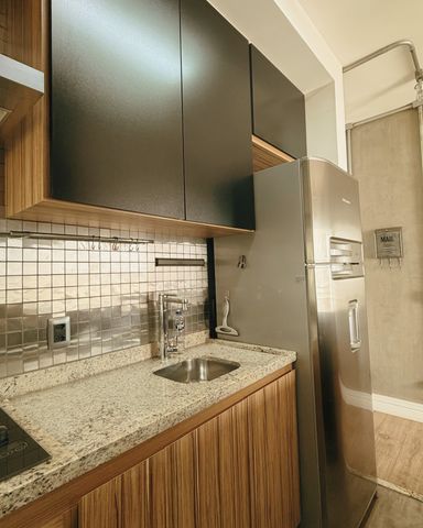A lavanderia é separada por porta de vidro e conta com móveis planejados.