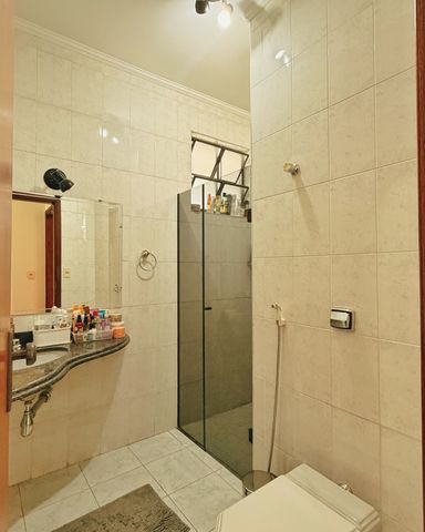 > Banheiro social, com gabinete e box de blindex