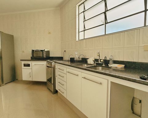 > Cozinha grande com fogão embutido, gabinete e armários