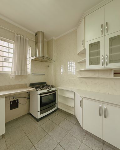 - Cozinha grande, repleta de armários, com fogão e coifa