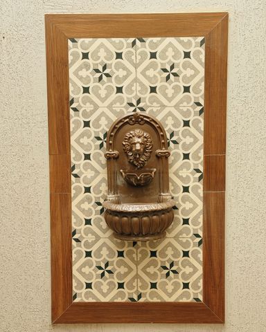 ▪️ Lavabo com pia em mármore travertino e papel de parede